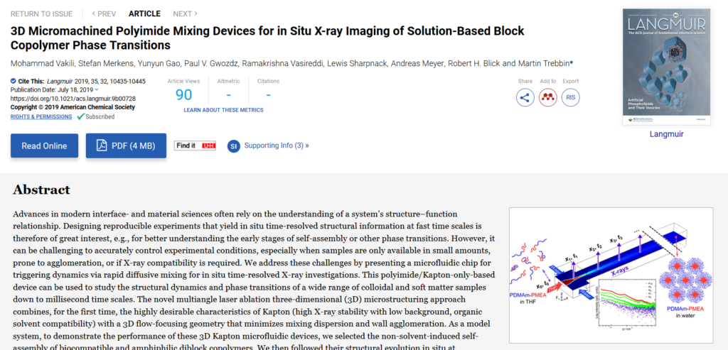 A joined publication entitled “3D Micromachined Polyimide Mixing Devices for in Situ X-ray Imaging of Solution-Based Block Copolymer Phase Transitions” with the group of Prof. Martin Trebbin has been publishedin ACS Langmuir