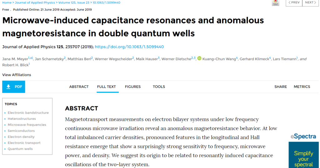 Our new publication “Microwave-induced capacitance resonances and anomalous magnetoresistance in double quantum wells” has been published today in Journal of Applied Physics.